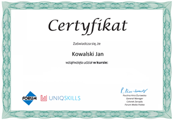 Poświadczający ukończenie kursu. Jesteśmy dumni z tego, że nasz kurs daje uczestnikom możliwość zdobycia certyfikatu potwierdzającego zdobyte umiejętności i wiedzę. To ważne osiągnięcie, które może pomóc w rozwoju kariery i otwierać nowe możliwości zawodowe.