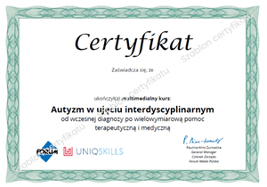 Jeśli chcesz dodatkowo otrzymać drukowany certyfikat potwierdzający Twój udział w kursie Autyzm Interdyscyplinarnie, dodaj kurs do koszyka i wybierz dodatkową opcję certyfikatu papierowego. Za certyfikat zapłacisz jedynie 139,00 zł netto i podkreślisz tym samym swoje zaangażowanie w rozwój. Certyfikat cyfrowy w formie online dostępny jest do pobrania po zakończeniu kursu w zakładce Mój Panel -> Certyfikaty.